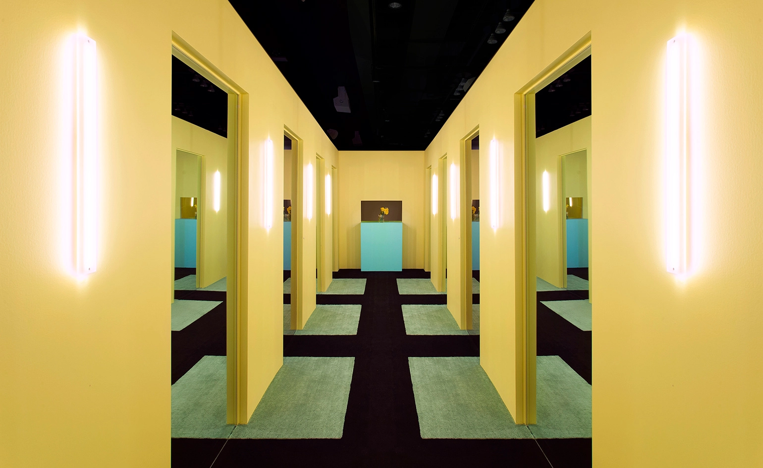 Staged at Cadillac House, the automotive brand’s open-ended project space in Soho, Cárdenas has collaborated with the performance-based artist Sahra Motalebi to create a graphic, Op-Art-inspired weave of spaces. As visitors meander through four separate rooms, each enveloped in hypnotic black and white patterns, colourfully-tinted windows or monochromatic shades of yellow, Motalebi’s discordant, vocals-only score plays overhead to hammer home each environment’s bewildering effect.