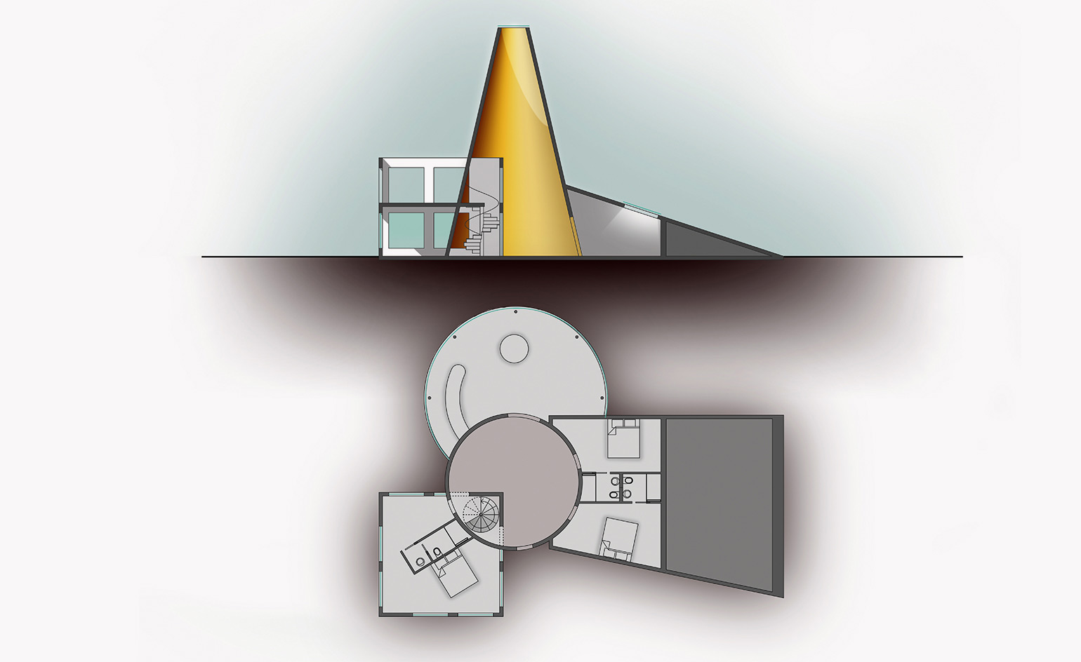 Intended as an inhabitable still life, Bellini’s prefab divides living spaces into a series of individual, discrete zones, each arranged around a central ‘cone’ that provides privacy, ventilation and light