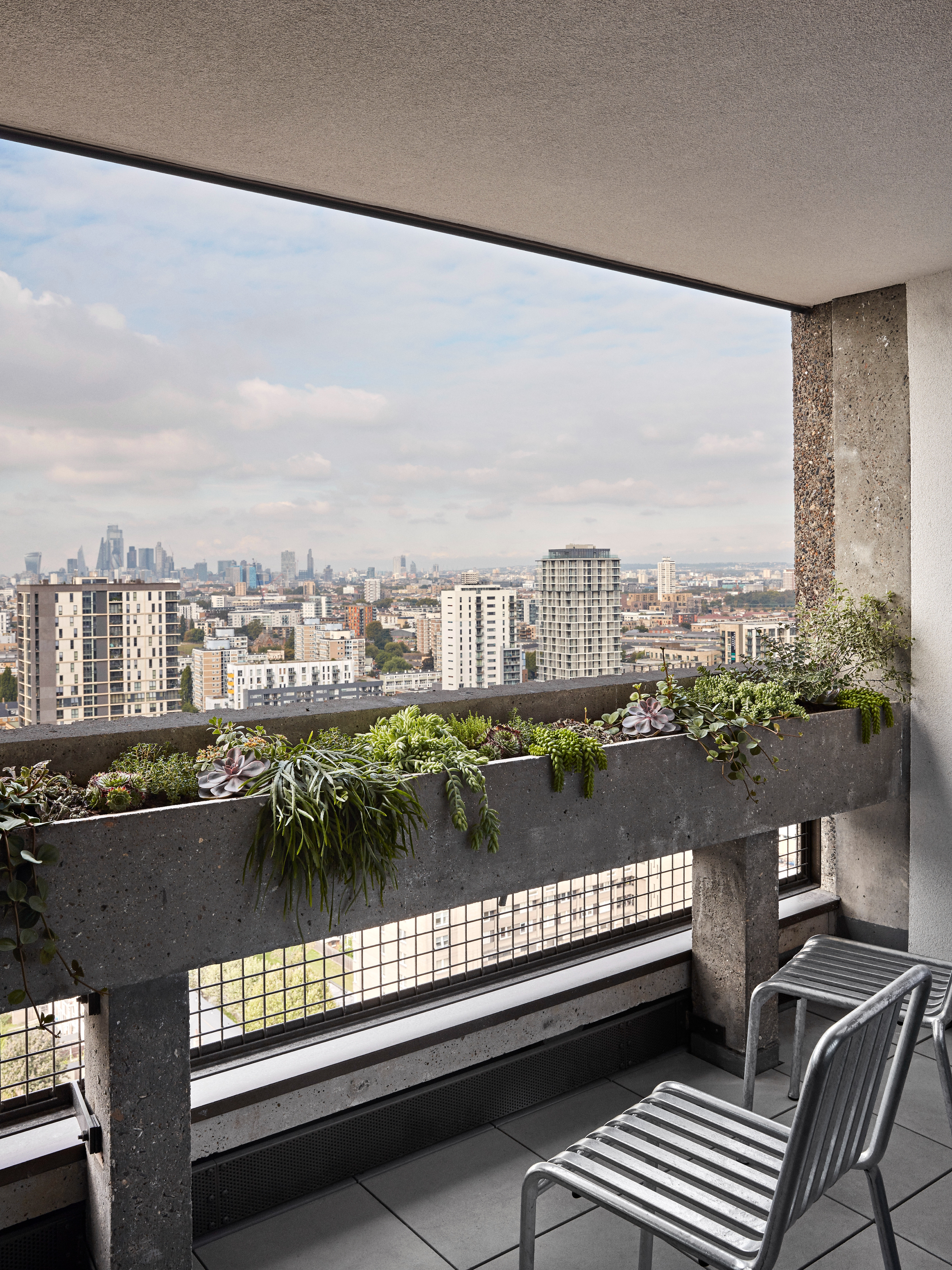 The two west-facing apartments each boast sunset views of central London, and have been dressed to evoke eclectic moods that reflect the experience of living inside a colossal brutalist hulk integral to British architectural history. The one bedroom (41.8sq m) designed by ARD with creative consultant Blue Farrier is based on the life of a kooky fictional character called Ursula Kim, while the SEW-designed two bedroom (60.8sq m) features bespoke rugs designed by 2LG Studio, their Capsule light and Stanley table, as well as a series of wallpapers inspired by the architecture of the building.