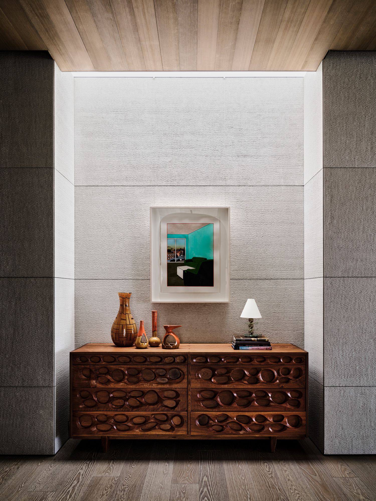 A Ken Price watercolour hangs above a wooden console by Phillip Lloyd Powell in the master suite’s hallway
