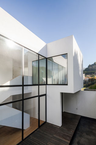 The stark cluster of blocks that forms Casa AA sits atop a hill overlooking the northern Portuguese town of Guimarães and the surrounding Douro mountain range. Built for a family of four and designed by local architect Filipe Vilas-Boas, the house's clean, white-washed walls make for a striking contrast with its rocky setting.