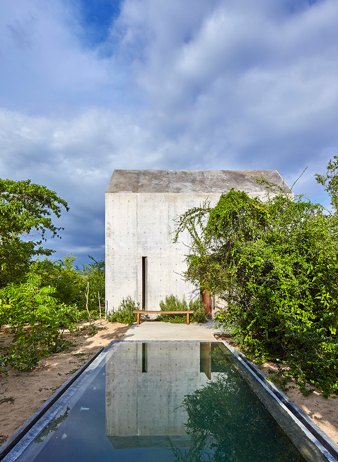 Two concrete terraces extend out from the core, one encompassing the swimming pool and the second an extension of the kitchen. Its concrete dining table runs continuously from the cooking area to the terrace, encouraging dwellers to throw open the shutters and mellow out with nature.