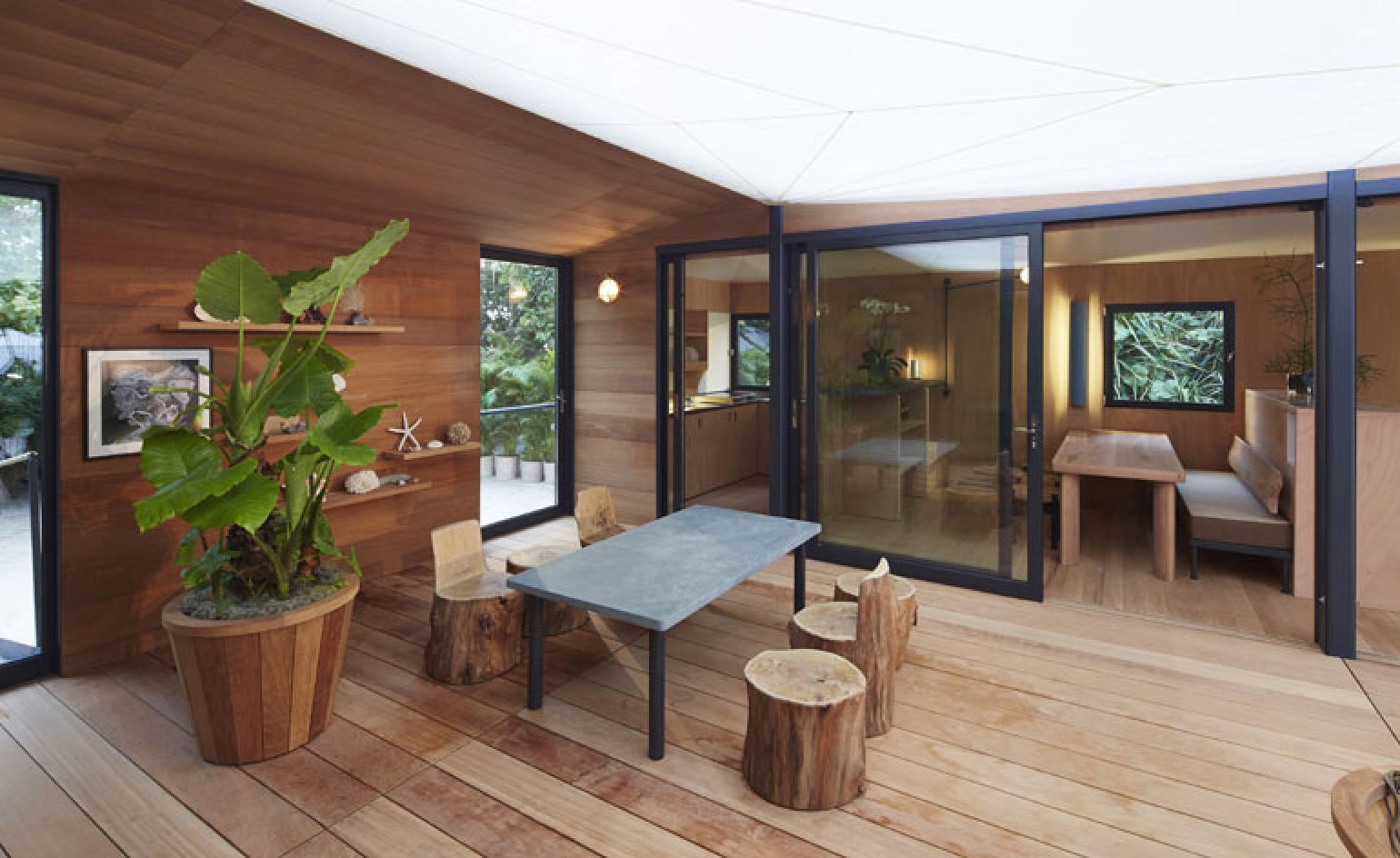 Designed to be erected beside water, its iroko floors and okuma walls were also chosen for their insect-repellent qualities