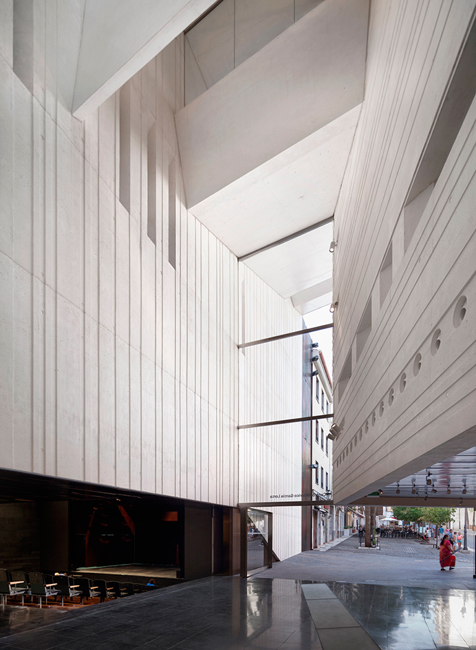García Lorca was born and lived in Granada, his career cut short when he was assassinated by the Nationalists in the opening weeks of the Spanish Civil War. His reputation grew clandestinely under Franco and he is now revered, especially in the city of his birth. Any building honouring the poet and playwright's name needed to convey a tough, solid image to the world, as well as reflecting the way the arts open up one's perception of the city. The rich layers of in-situ concrete that make up the faceted exterior mirror the city's traditional use of stone.
