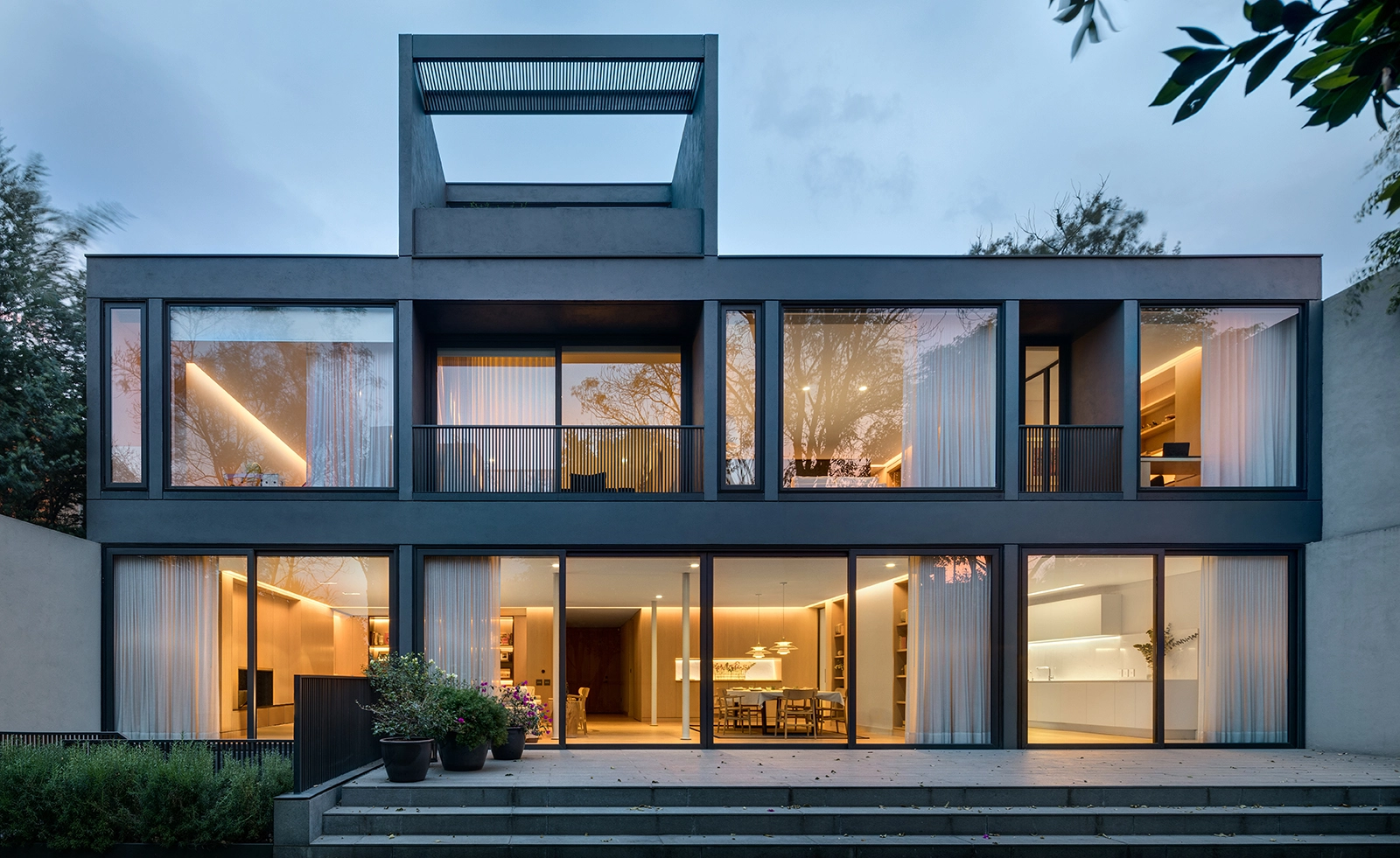 HEMAA Arquitectura introduced a dramatic treatment of light and dark. The monolithic dark grey stucco façade at the front of the house, which offers privacy to the clients, is a huge contrast to the glazed façade to the rear of the house, which opens up the the garden to fuse indoor and outdoor living.