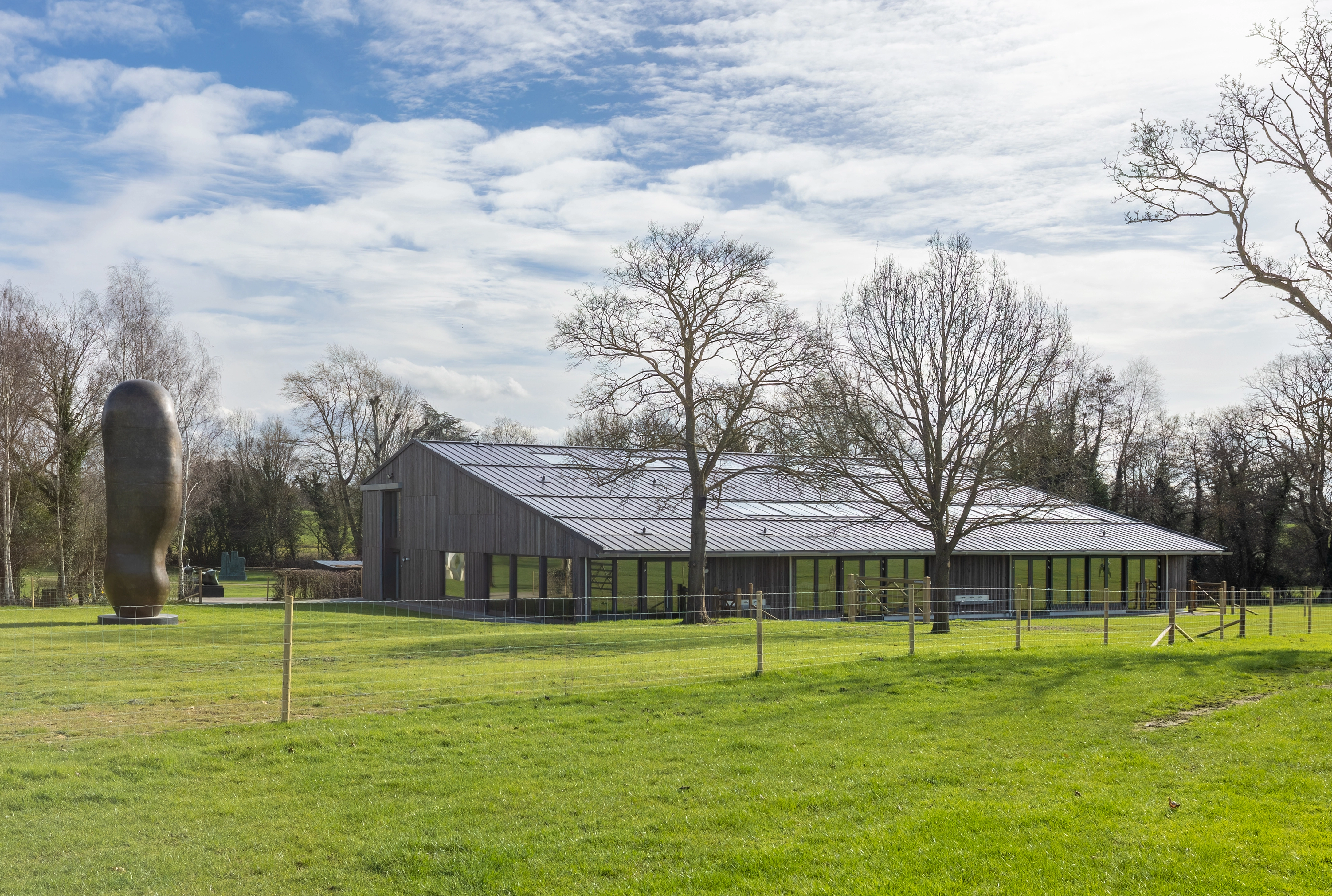 Henry Moore’s 1981 Large Upright Internal / External Form stands beside the newly extended barn