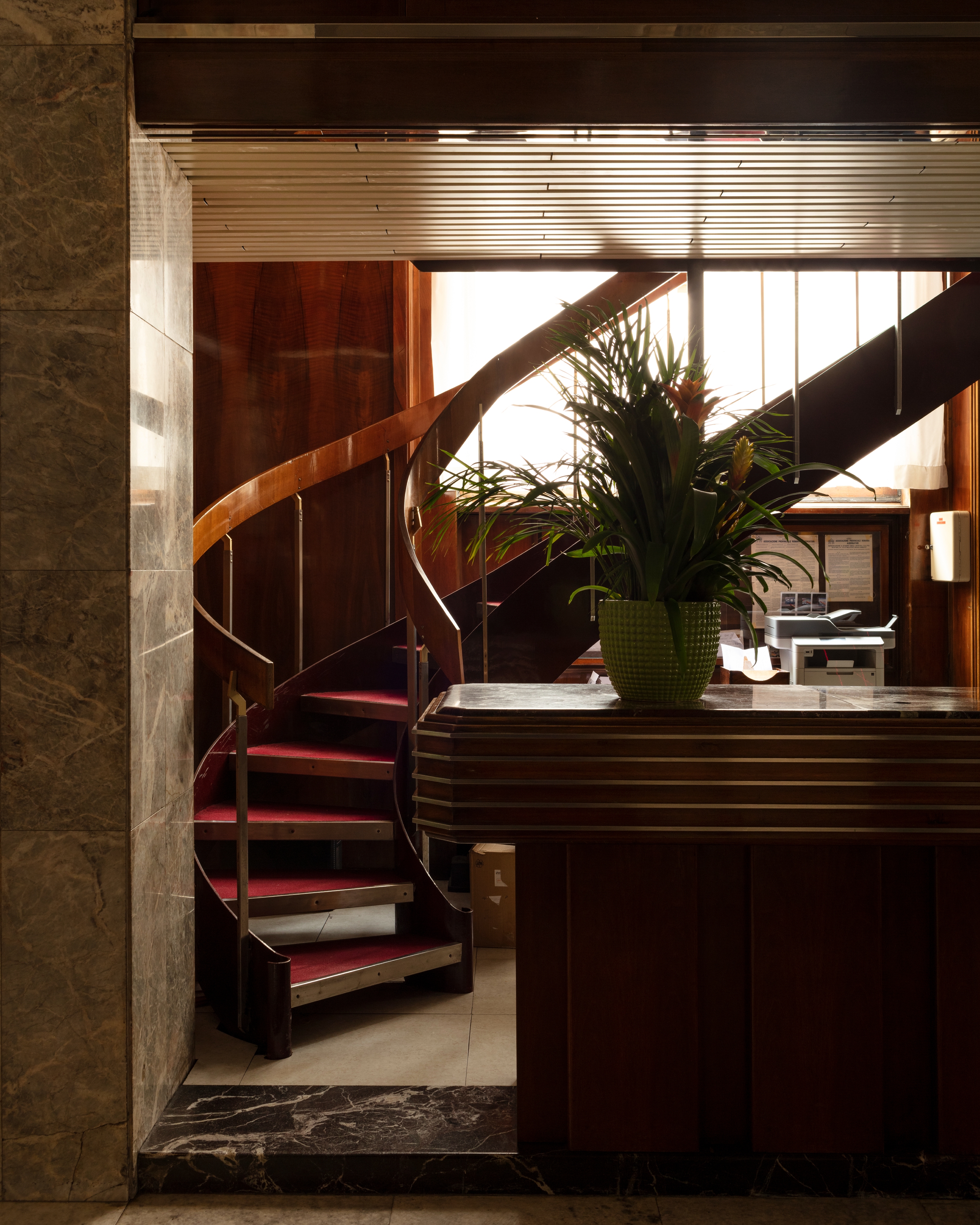 The central lobby hall is lined by wall sconces designed by Gio Ponti. In the centre is a large fireplace in green marble, lined with wood marquetry that displays the Punishment of Prometheus. To the right of the main hall is the bar, most likely one of the best-kept art deco bars in Europe; it’s a style that so often has been destroyed and of which so few complete interiors survive. The bar canopy is lined from the inside with a blue glass mosaic-studded sky that floats above the counter, cantilevering off a mirror wall. This maritime, ocean-liner-like flair evokes the feeling of departure into a new future – but one that seems weighed down by a giant rock; the heavy marble staircase won’t let this ship travel far.