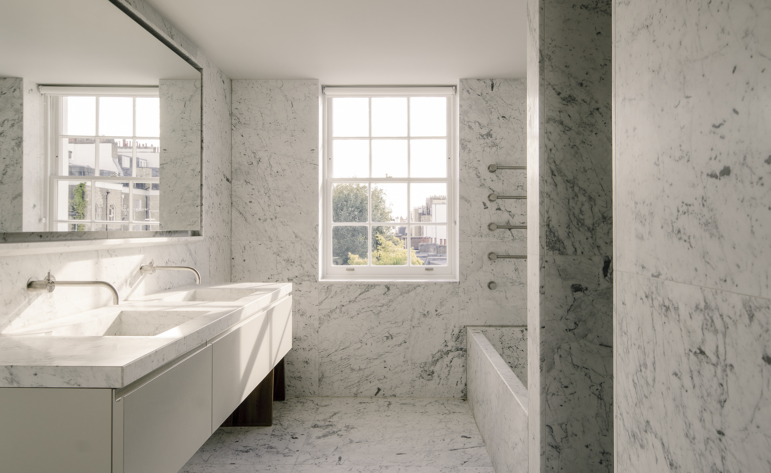 Once planning permission was granted, the team focused on opening up the space, completely rebuilding the house with a new basement, rear façade and 'a new steelwork to frame everything and support the new top floor and those marble bathtubs'.