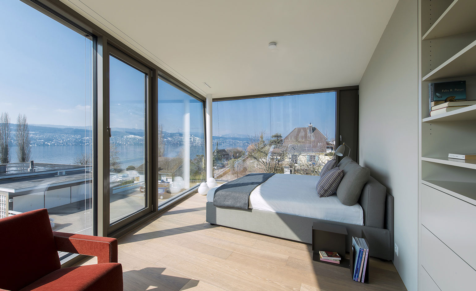 Few areas are closed off by doors, offering residents openness and a steady 180-degree vista across Lake Zurich to the mountains beyond