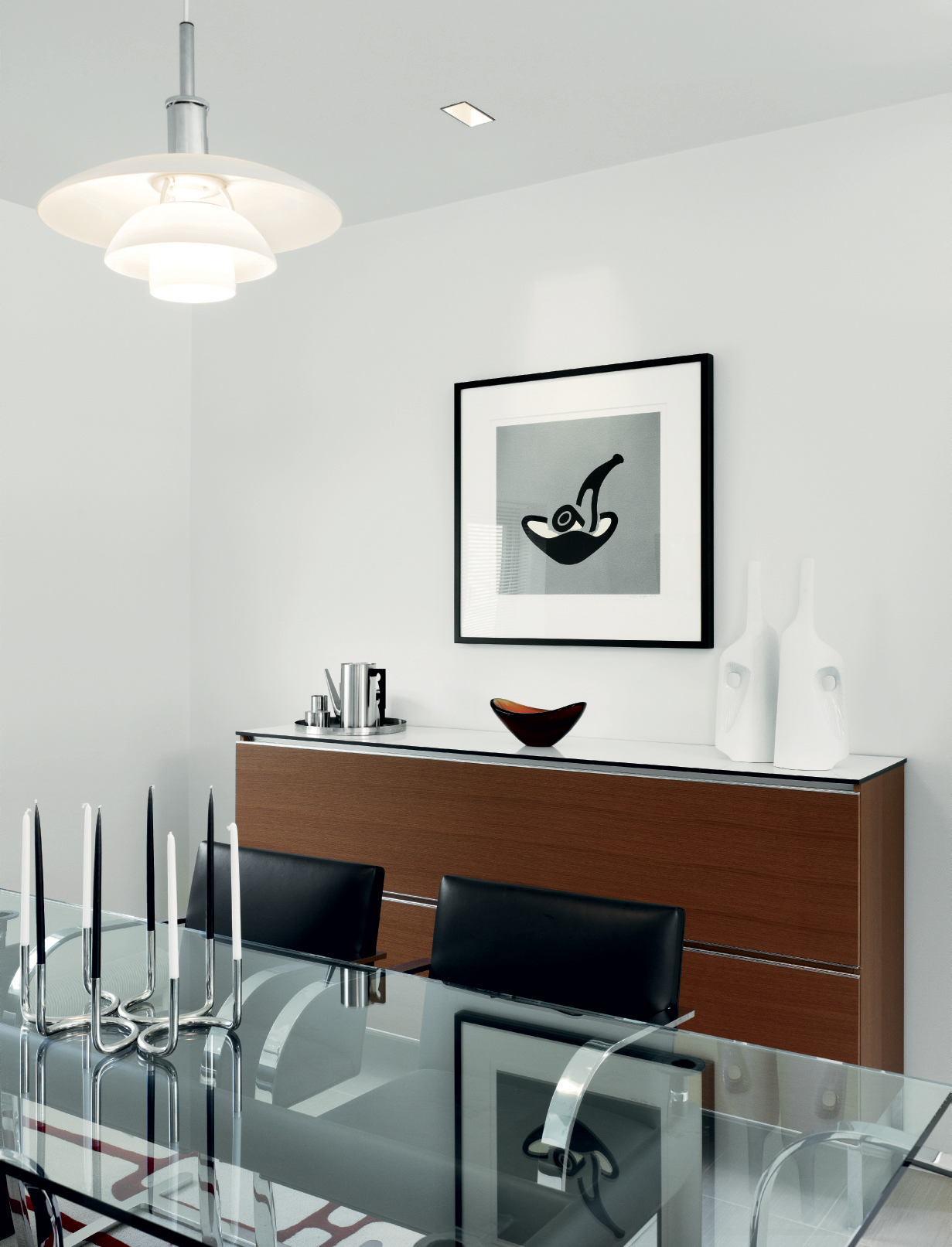 In the dining room is Patrick Caulfield’s Grey Pipe (1981), alongside Mies van der Rohe’ ‘Brno’ chairs and an Arne Jacobsen silver coffee set.