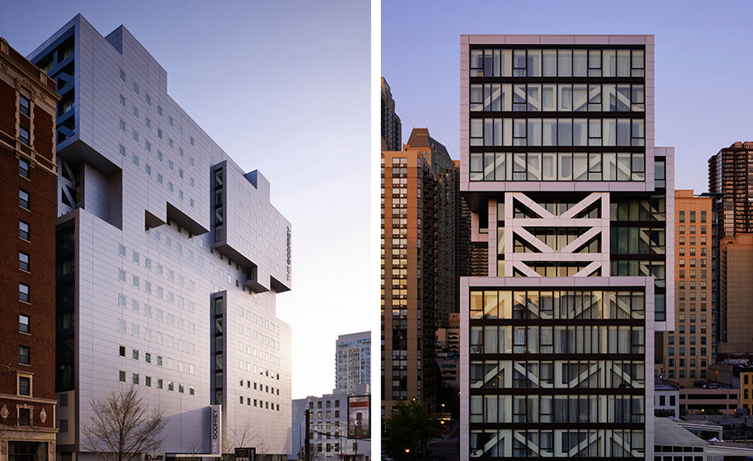 The 16-story boutique hotel Godfrey, on the corner of LaSalle and Huron Streets in the Near North, purposely exposes its staggered and shifted steel truss system.