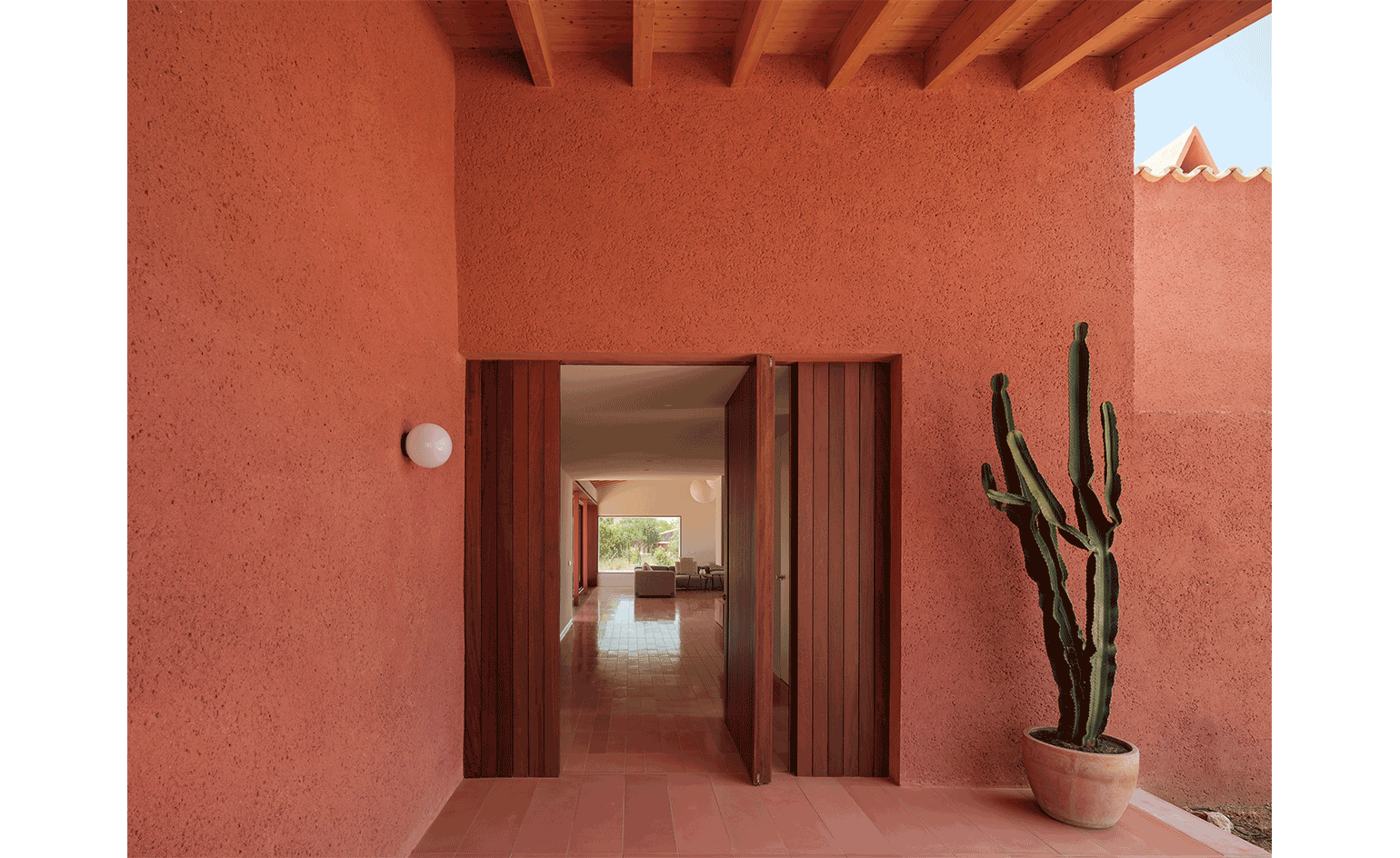 The structure's warm terracota-pink colour (concrete tinted with a shade of red) is a defining element in the design. Reminiscent of the work of Mexican modernist Luis Barragán, known for his use of light and bold colour, often in compositions that feel tactile and close to earth, the house reads as at once textured and connected to the natural landscape around it, but also graphic and contemporary.