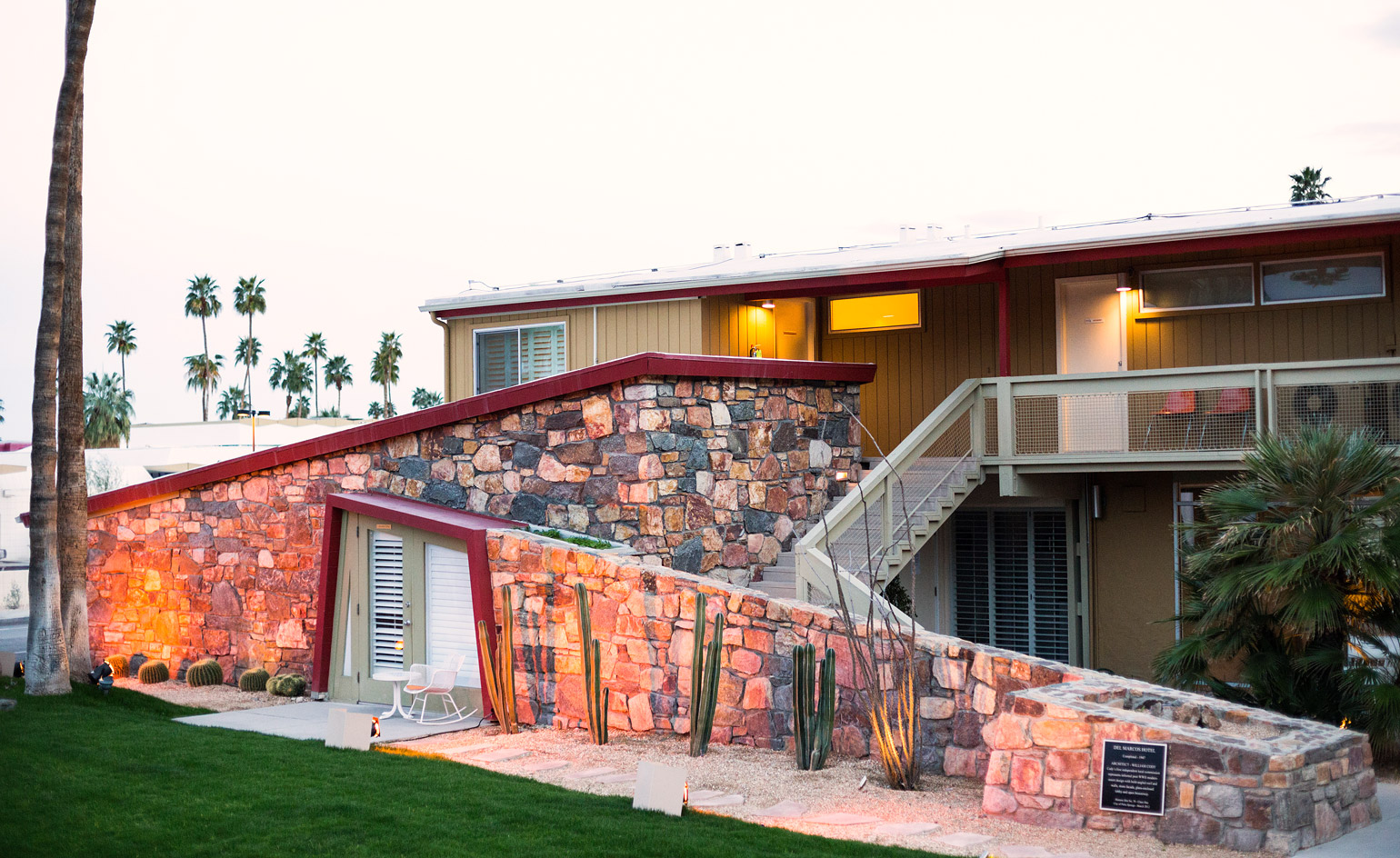 The Illuminated Modern Sunset Bus Tour highlighted architecturally significant midcentury and modern building facades along Palm Canyon Drive and surrounding neighbourhoods, including the Del Marcos Hotel