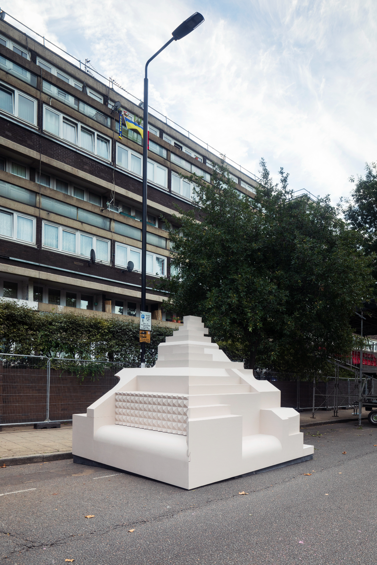 Nestled on Great Western Road, next to the judging zone on Sunday 28 August and Monday 29 August 2022, the stepped sculpture formed a place where people could take a break as revellers paraded the streets of West London. ‘The idea of resting is such a powerful invitation. This pavilion is a place for you to lime,’ says Barrington. In the Caribbean ‘liming’ or ‘to lime’ is a phrase used to describe people hanging out, chatting, and taking it easy. While many may have needed a break from the action, that isn't the only purpose the structure serves. The form also works as a humble performance platform, a backdrop for a stage, or a shaded retreat from the summer sun.