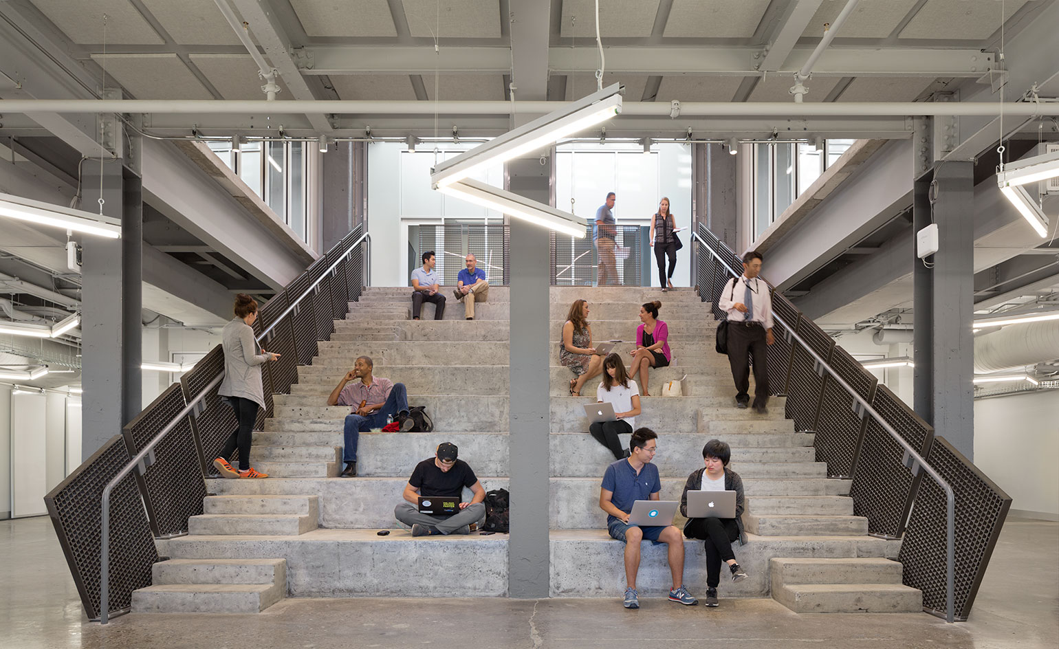 Inside, the facility is filled with labs, open work stations, test and research facilities and start-up garages (enclosed, in fact, with glass garage doors). Open halls – which never dead-end – and lots of glazing encourage connections between workers, keeping them from sequestering themselves away. The centrepiece is a two-storey concrete bleacher, around which extend raw, simple spaces that emphasise the building’s structure, including giant ducts, metallic conduits, and an exposed steel and concrete frame.