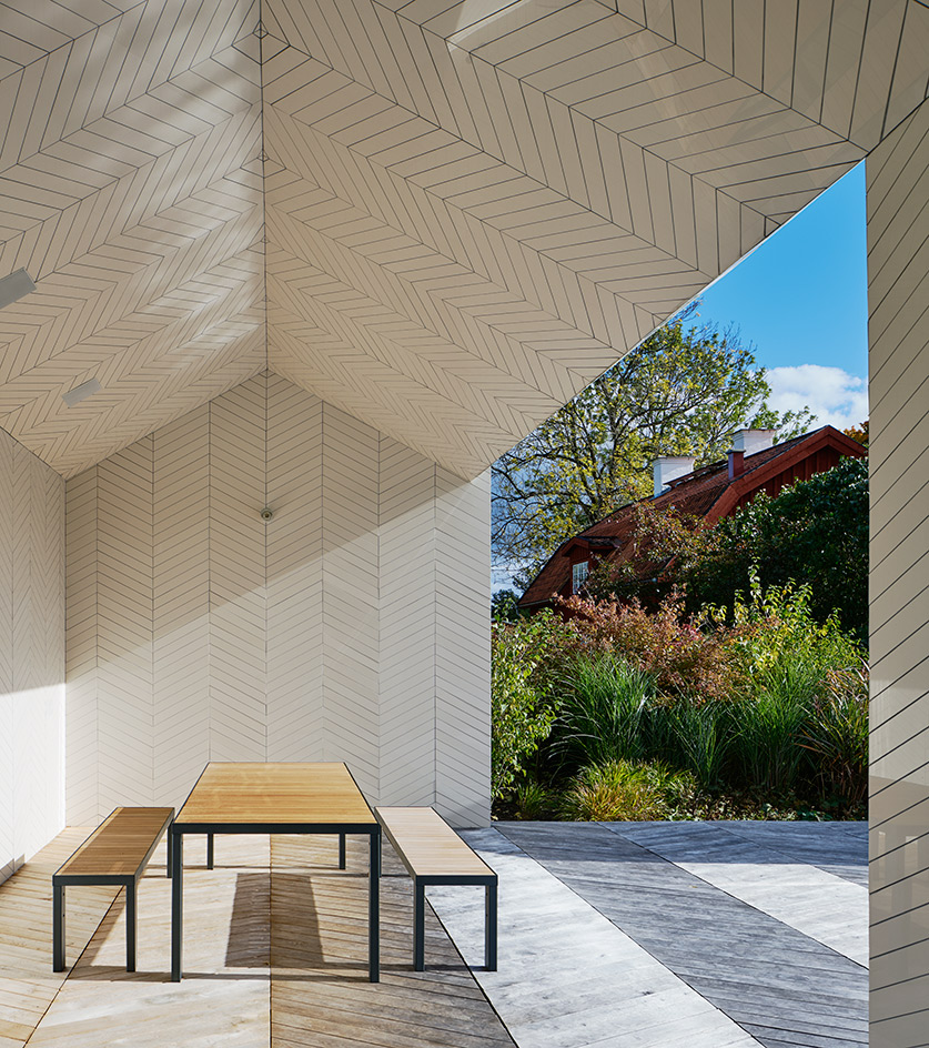 ‘There are only four materials,’ the architects say, ‘wood, tile, water and glass – the chevron pattern from wood is superimposed on tile, amplified and modulated by water and reflected by glass.’ This design runs deep.