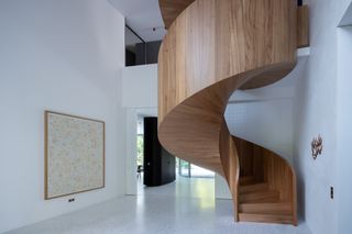 An adjacent glass-walled volume holds a small greenhouse that doubles as a cocktail bar, while connecting the floors is a circular elm staircase executed by Bavaria-based carpenters Rasshofer, who were instrumental in the creation of the overall interiors. This sculptural vertical spine dramatically stitches together the house’s different zones.