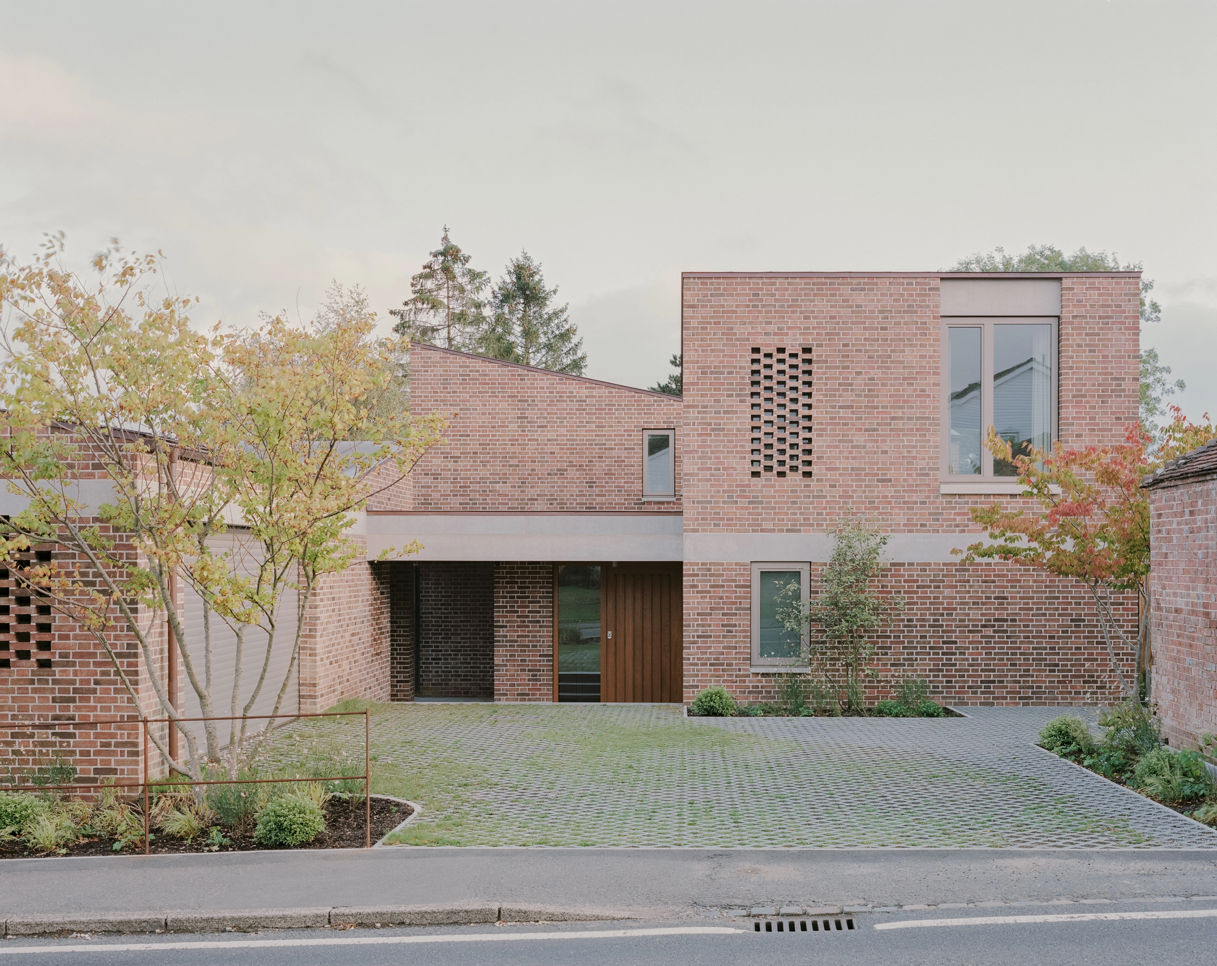 Designed from the outset to offer a simple, straightforward construction path, the house is faced in soft red clay bricks and lime mortar with visible precast concrete elements defining the floor plates and lintels.