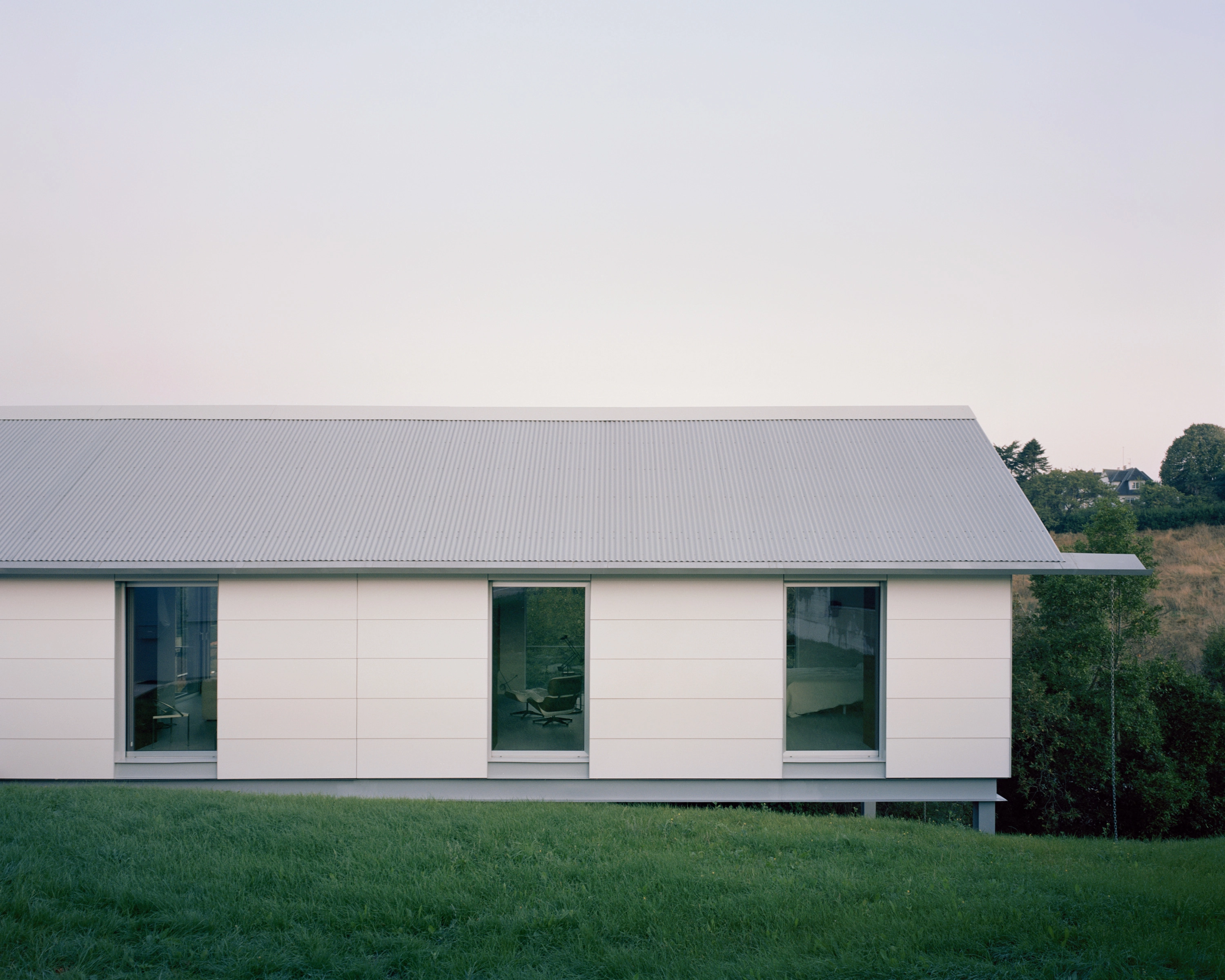 At the same time, it was important for the architects to compose an architectural vocabulary for the home that felt restrained and methodical. This allowed them to use modular construction methods in order to have a minimal impact on the land. Indeed, the structure was fully prefabricated in a workshop, its parts simply transported, ready-made, and assembled on site. It comprises a lightweight steel structure, a façade made from sandwich panels, insulation, and a corrugated metal roof.