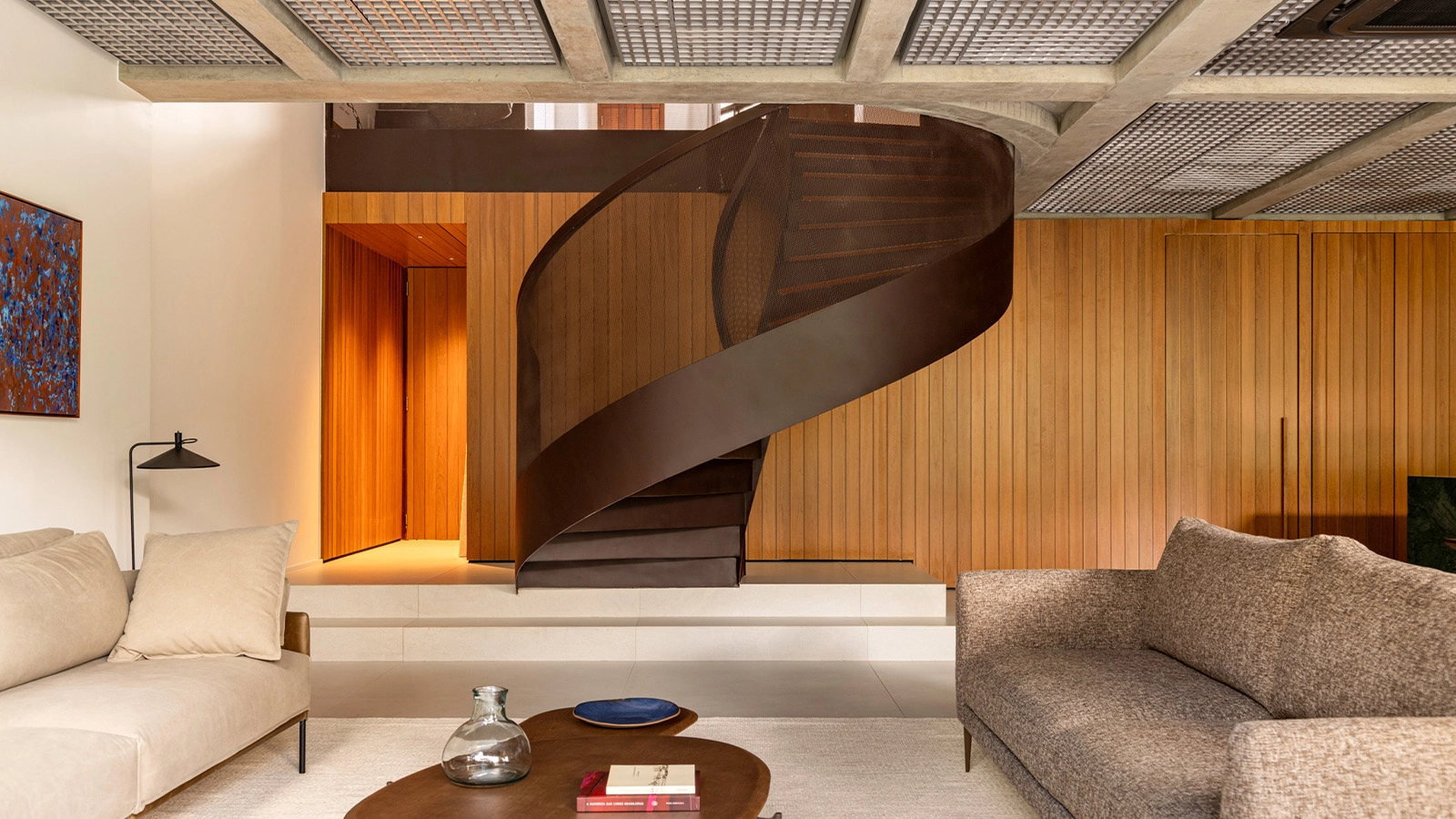 The honeycomb ceiling is a subtle yet intriguing design element. The greys of its metal grid and the surrounding concrete contrast with the warm, darker tones of the staircase and wood. ‘The apartment was based on the desire to create integrated and functional spaces, reflecting the client's needs and preferences. The search for harmony between practicality and sophisticated design was the guiding principle for the firm in conceiving the project,’ say the architects.