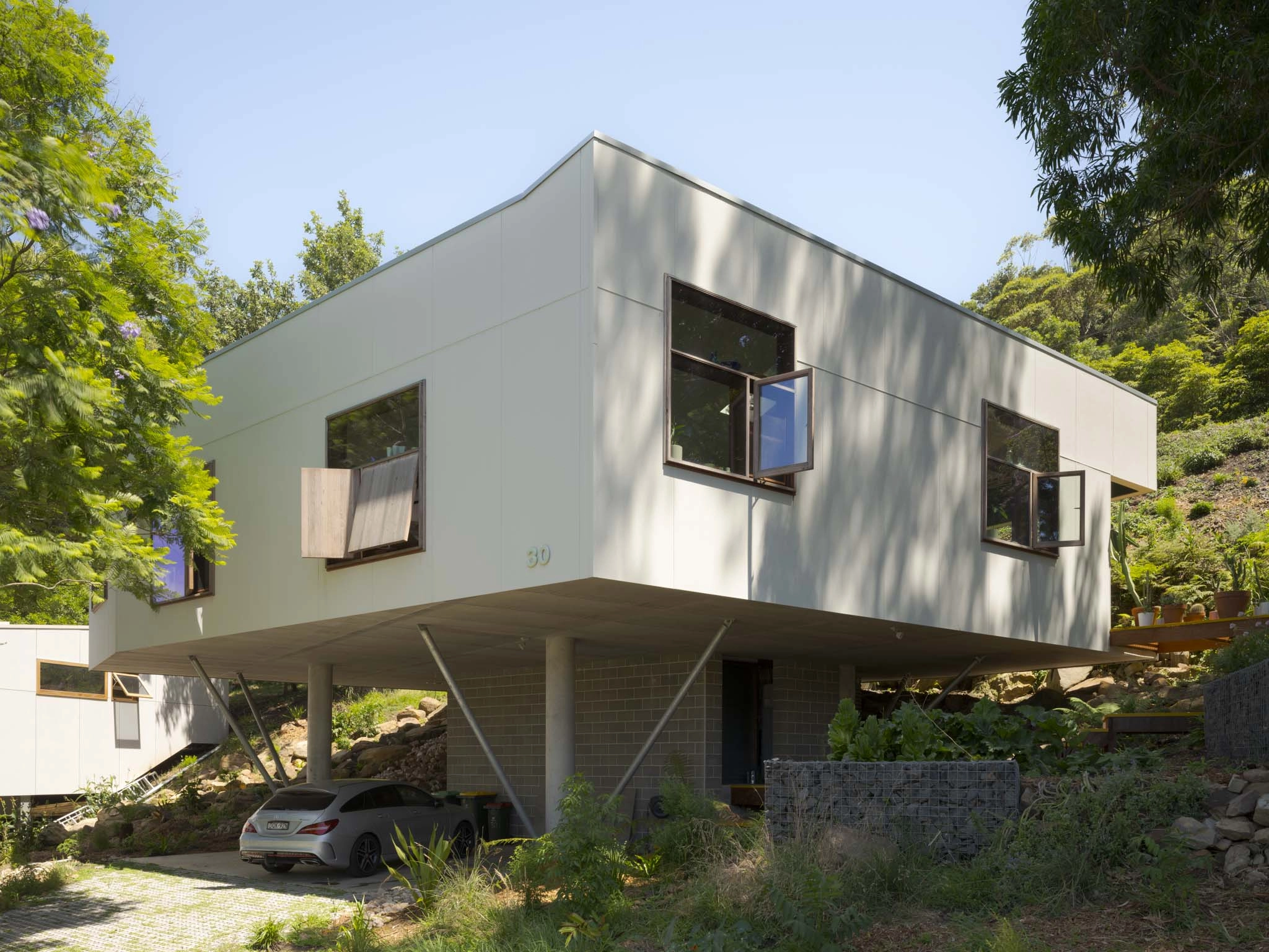 Approximately 160 square metres in area, the Scarborough house is constructed in a steel frame with the walls clad in fibrocement – the roof in steel and the floors all tiled, with each space in a different coloured tile. Working with landscape architect Jane Irwin, the approach to the elevated home, supported on concrete columns with steel bracing, is via a meandering set of external stairs to the front door.