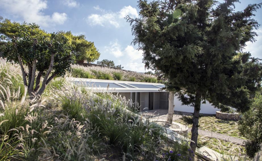 Meanwhile bedrooms, bathrooms and auxiliary rooms are located further into the slope, behind and below the main living areas. This part ‘is accessible from a passageway through the existing olive grove and it is connected with the outdoor living area above through a 2 metre wide stepped ventilation opening,' explain the architects.