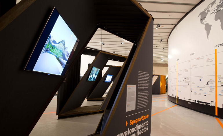Designed by the New York/Naples firm of Lot-Ek, the exhibition presents videos of key works by a slew of architects in modified industrial shipping containers, with architectural models also on show and a timeline graphic along one wall