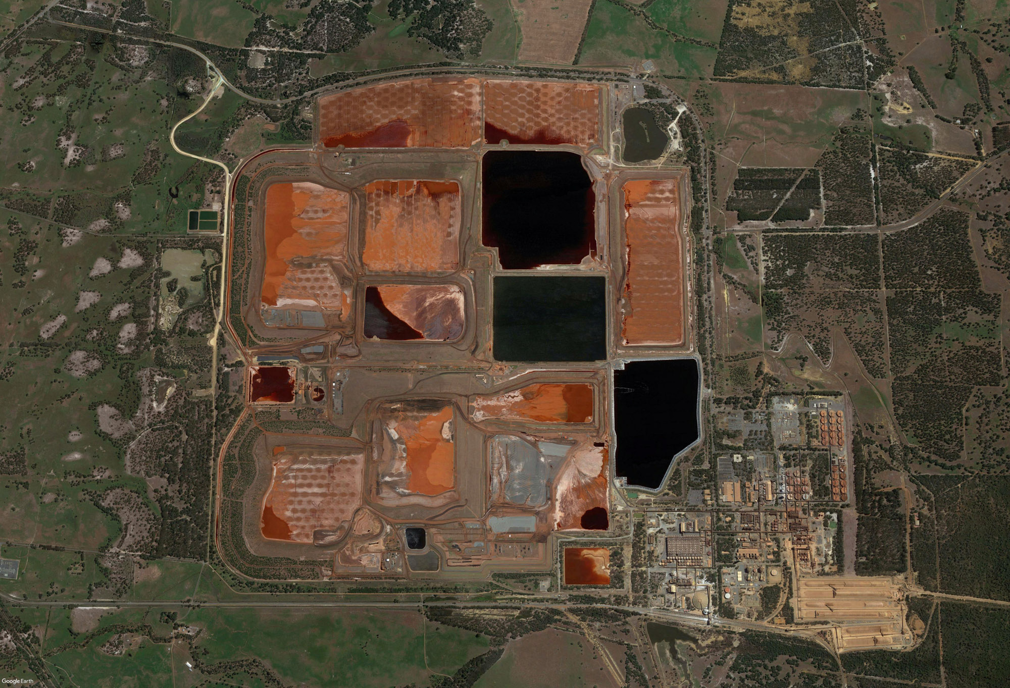 A Google Earth image reveals vast red mud pits alongside an aluminium plant in Australia, containing some of the 150 million tonnes of the waste material that is thought to be generated each year