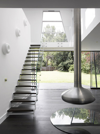 A dramatic floating staircase with glass balustrades rises from the house's expansive open plan reception room