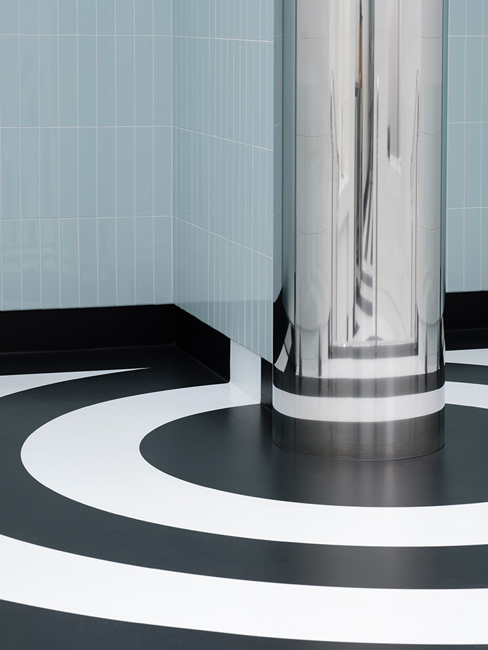 The lobby features black and white decor, matched by mirror-clad columns and an artwork by Wolfgang Tillmans on the right wall. Polished chrome details, white and black stone and a checkered marble flooring compose an interior that exudes elegance and luxury – infused with a quiet sense of drama. The ground floor lobby architecture includes a front desk, a separate space for meetings, and an adjacent coffee point.