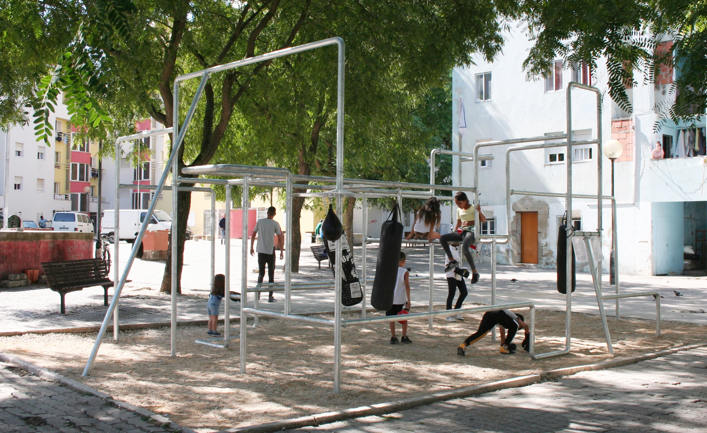 A gaggle of excited children have descended onto a simple structure made of metal pipes, a new addition to their neighbourhood in Olaias, north Lisbon. Boxing gloves have been distributed and a handful of parents stand near by, as older children teach the younger ones techniques on the hanging bags. Plastic chairs and tables have been assembled, music plays and pots of stew are bubbling.
