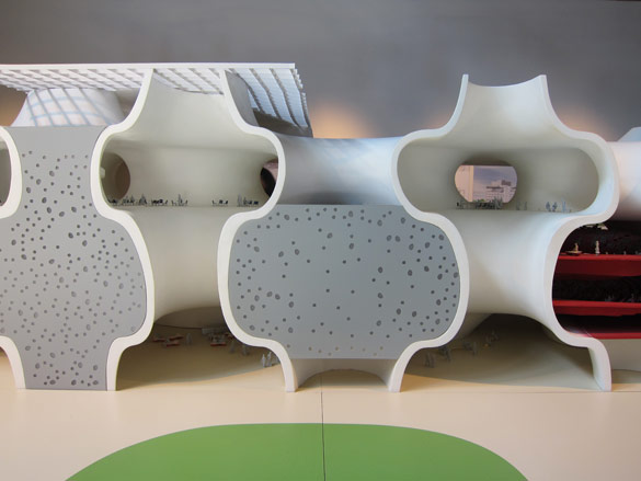 The most old-fashioned pavilion - inside and out - this smoked glass and steel structure, by Italian masters BBPR, houses an installation by architect and sculptor Philip Beesley titled 'Hylozoic Ground', a hissing, translucent inverted garden of clear acrylic fronds and stalks. It is certainly atmospheric, with something of the neo-organic quality of the models of Antoni Gaudi, and there is also a refreshing absence of digital media on display. Even so, the biological/architectural crossover feels rather out of time, a science fiction vision from the past (rather like the country's pavilion itself), awaiting a revival of interest.