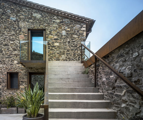 The contrasting materials represent notions of old and new, with modern clean cut glass juxtaposing the property's rustic stone walls