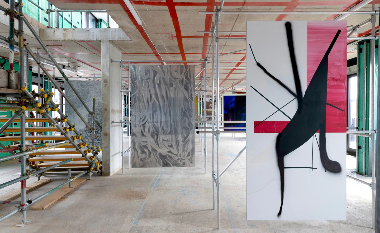 The exhibition’s design complements the rough, industrial feel of the duplex. Mimicking its existing scaffolding, George Lewin Studio has bolted the works to support structures made from slim aluminium poles, so that viewers get to see the back as well as the front of each piece.