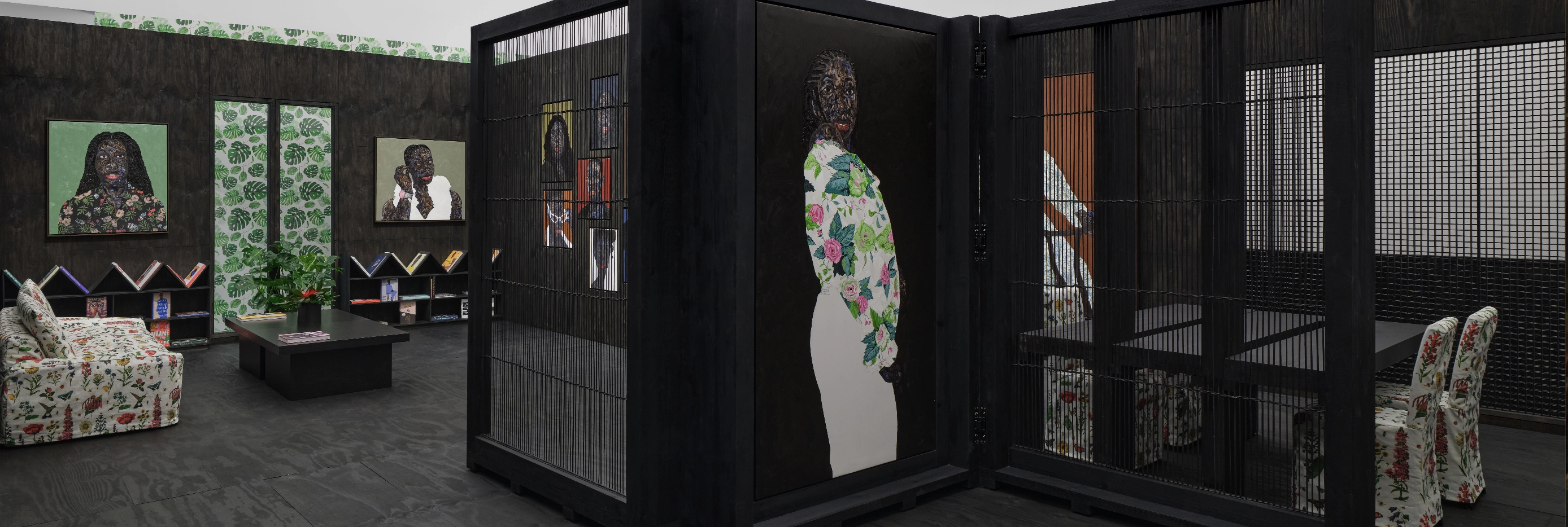 Boafo’s practice has continued to expand beyond the canvas, particularly in the spatial environments that have framed his recent exhibitions. His current exhibition in Los Angeles, presented at Roberts Projects in collaboration with architect and designer Glenn DeRoche of DeRoche Projects, extends this interest through an installation that reconstructs the physical architecture of his studio in Accra. The exhibition places a group of new paintings within this recreated environment, inviting viewers to experience the work within the spatial conditions that shape its production.