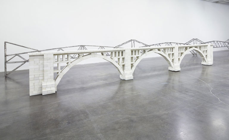 Burden's newly unveiled works - two intricate, yet mammoth depictions of bridges made from concrete and Mysto Type I Erector parts respectively - also make the most of this life-like quality. Both constructions spread comfortably hinting back at Burden's study of architecture back in college.