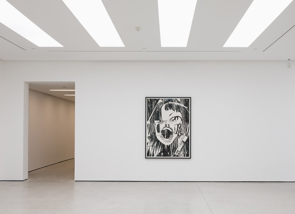 For the works at White Cube’s Hong Kong outpost, Marclay cut slivers of images from Japanese manga magazines and American comics to create a face caught mid-scream. The small, detailed collage is scanned, enlarged and carved into plywood or woodchip composite boards using a computer controlled carving machine. The woodcuts are printed with an etching press.