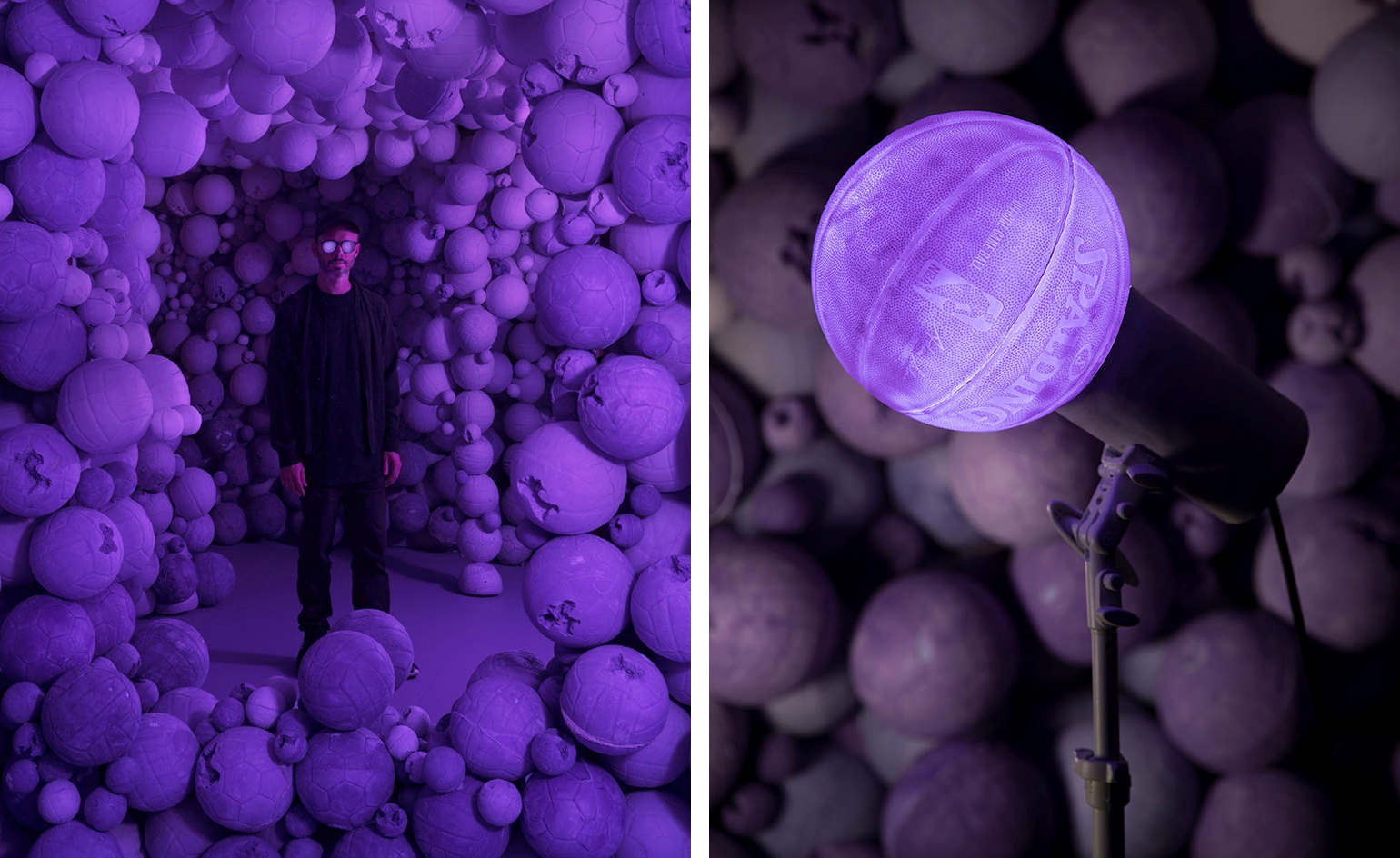 Arsham’s installation of amethyst basketballs – realised in varying shades of violet in different sizes – are cast from crushed crystals and compressed into moulds to great visual effect. Courtesy: Galerie Perrotin