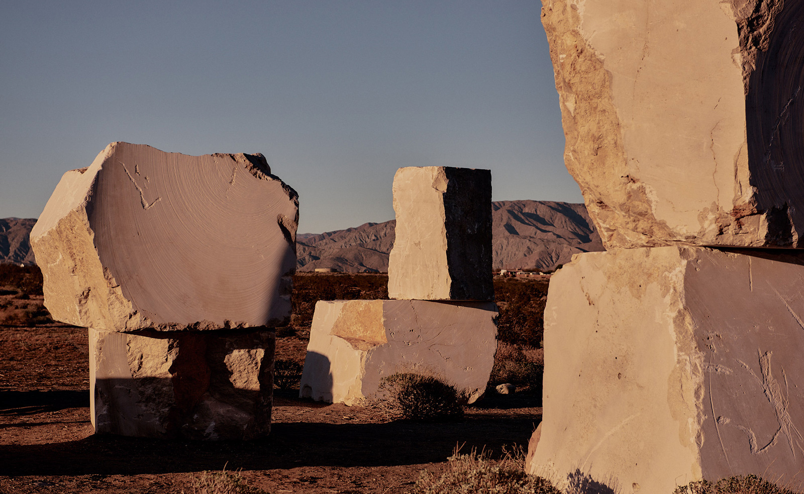 The rocks are marble, usually something carved into sensual statuary or polished into luxurious bathroom tiles, but here left as immense, irregular lumps, the shape they were when extracted from a Mexican quarry. The US-Mexican border is referenced through the migratory act of moving these stones, their newly shaped objectness in Coachella counterpointed by an extractive void in Mexico. They stand proud, glowing in golden-hour light, as if they were meant to be, as if they have accomplished their own idea of the American dream and found their celebrated place.