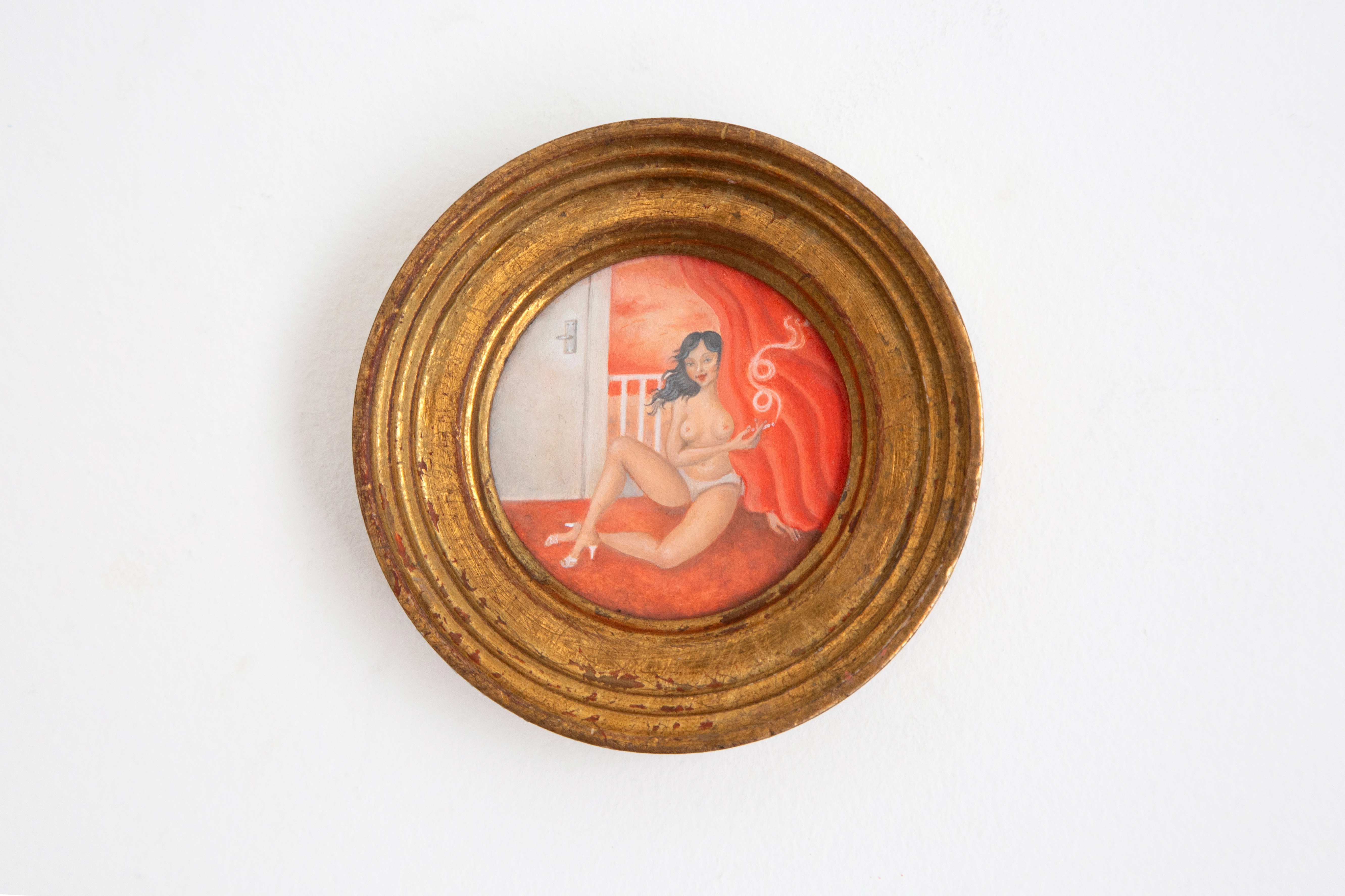 To get a good look at the paintings in Lorena Lohr’s Motel Nudes series, you must lean in closely. They are miniature round works, some as small as six centimetres wide, each an imagined portrait of a woman in a motel room, 'caught mid-action, kind of luxuriating in suspended time' as described by the artist. Lohr dreams up every detail in an instinctive, open way, but draws from her many travels around the American Southwest, giving the paintings a layered, 'palimpsestic quality.' Motel Nudes is an ongoing series, and four recent paintings are newly on show in London at Soho Revue, as part of the group exhibition Behind the Curtains.
