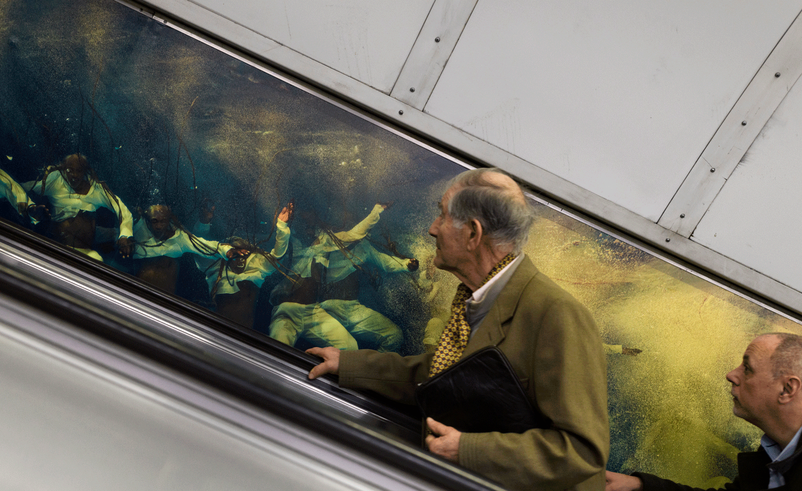 The results, when viewed together, as you ride the escalators down into the Underground labyrinth or back up to the city streets, are immersive, a stop-motion of subjects moving through water.
