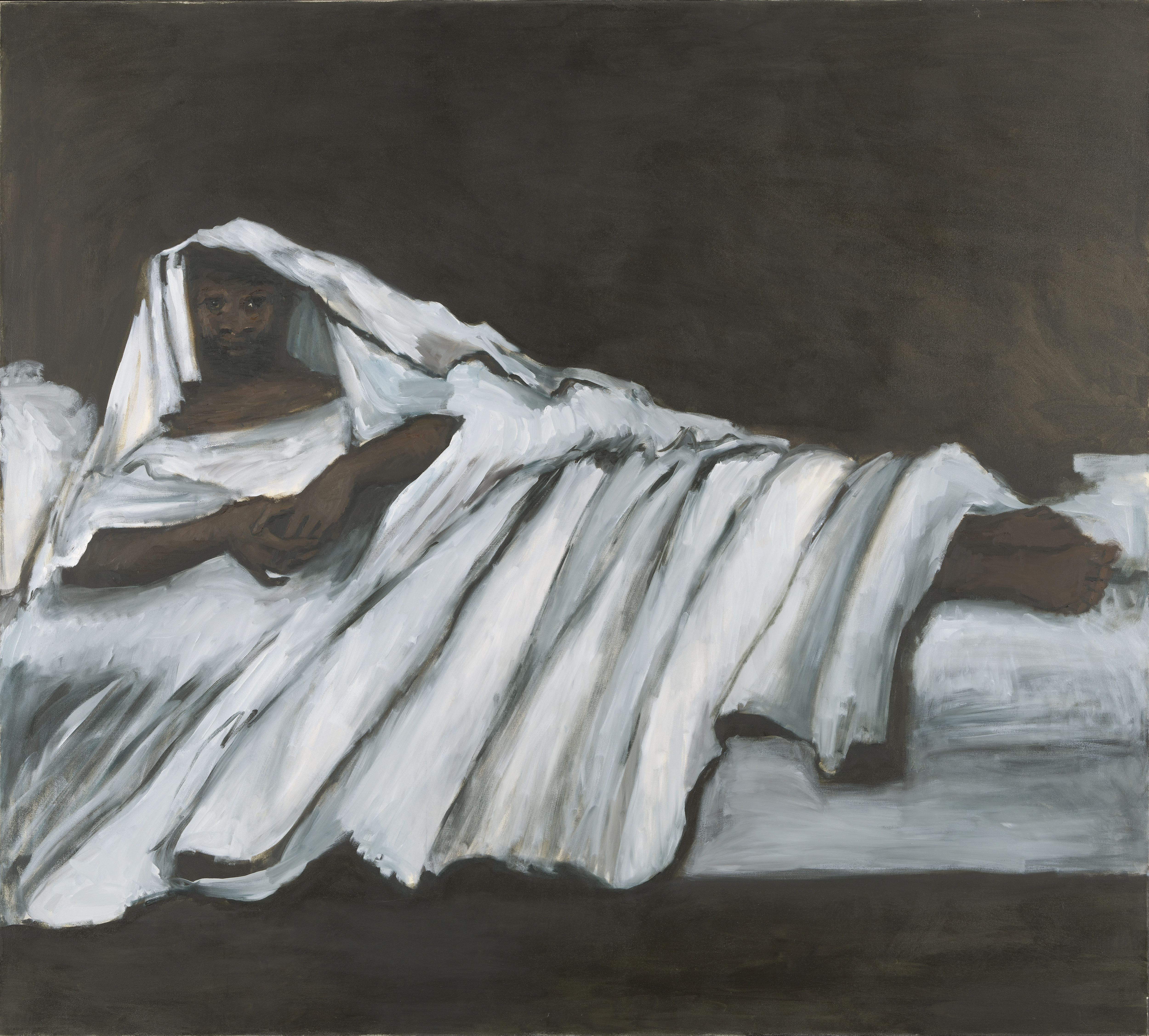 In room two, there is an eye-catching contemporary painting titled Kasbah (2008) by Lynette Yiadom-Boakye. The artwork features a Black figure wrapped in a white shroud, gazing directly ahead. Their eyes seem to follow viewers around the room, and the sitter's gender is ambiguous, reflecting a fluid identity. The title Kasbah refers to a citadel or the Arab quarters of a North African city and it references Édouard Manet’s Orientalist painting Olympia (1863), which depicts a white woman attended by her Black maid, highlighting the racist and sexual legacies of Western art. With Yiadom-Boakye’s painting, the figure confidently occupies space.