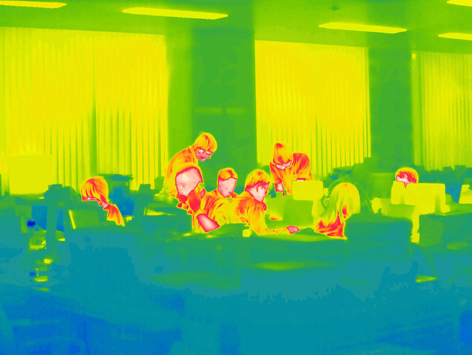 The thermographic technology seems capable of allowing us to see through Price’s subjects – as if they’re being X-rayed. The warmth of their bodies translates as a pinkish redness, set against the yellows and greens of their clothes and their homes, or the deep indigo-blue of surrounding vegetation. The images invites us to search for strange imperfections that might not be visible to the naked eye. It’s also a misnomer; radiation cannot be seen, or tasted or heard or touched. Price invites us to look for something that isn’t there, until, suddenly and often fatally, it is.