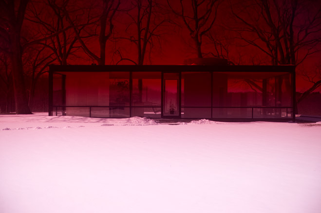 Taken with a digital camera, Welling used coloured filters - alongside flawed, fogged and tinted sheets of glass - to produce lucid interpretations of Johnson's 1949 structure.