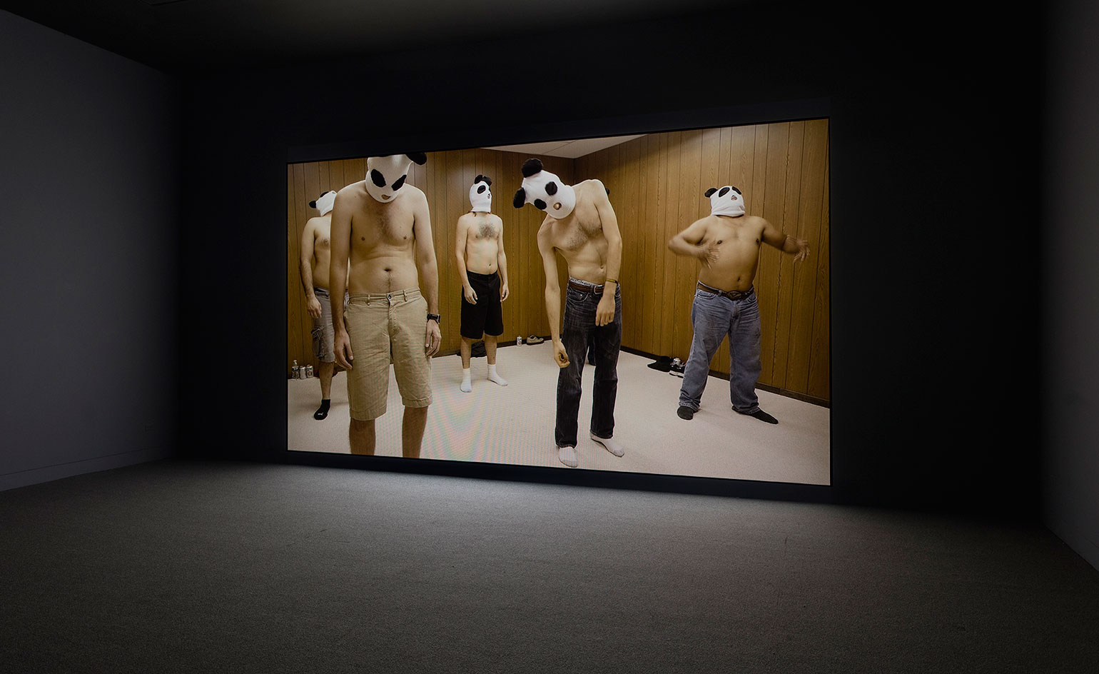 Pictured: a still from Kenneth Tam's video piece Breakfast in Bed, featuring seven non-actors participating in a mock men's social club