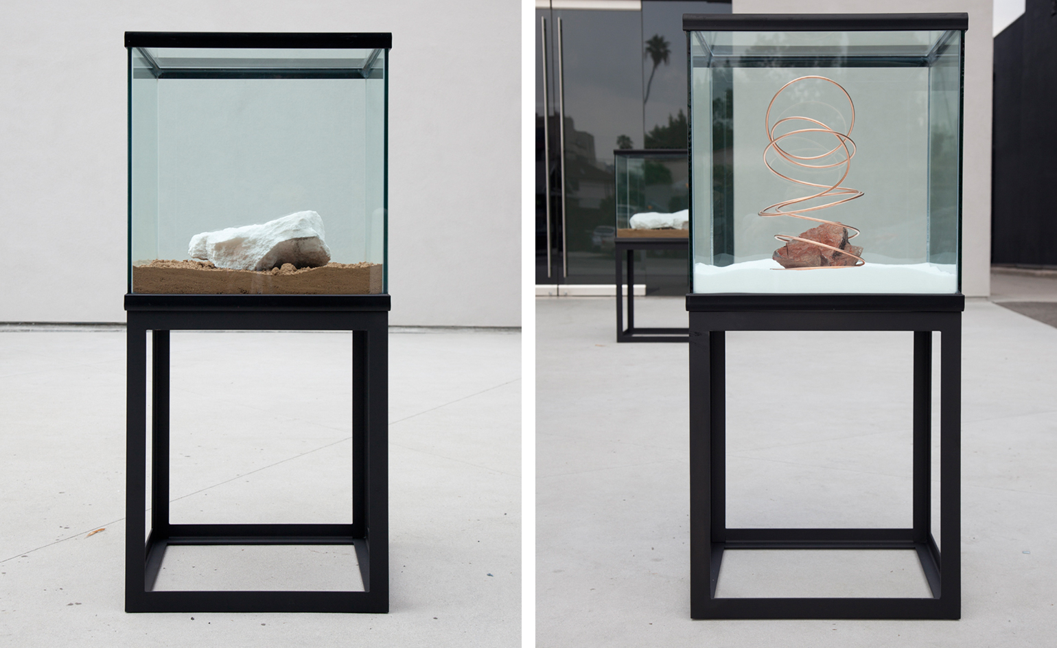 In the three sculptural pieces, each encased in a glass and steel pedestal, and using contrasting materials, heavy-looking obsidian is paired with honey and lustrous copper, while decomposed granite (commonly used to grit urban terrain) is combined with salt. The geological compositions of these substances seems as important to the artist as their aesthetic yield.