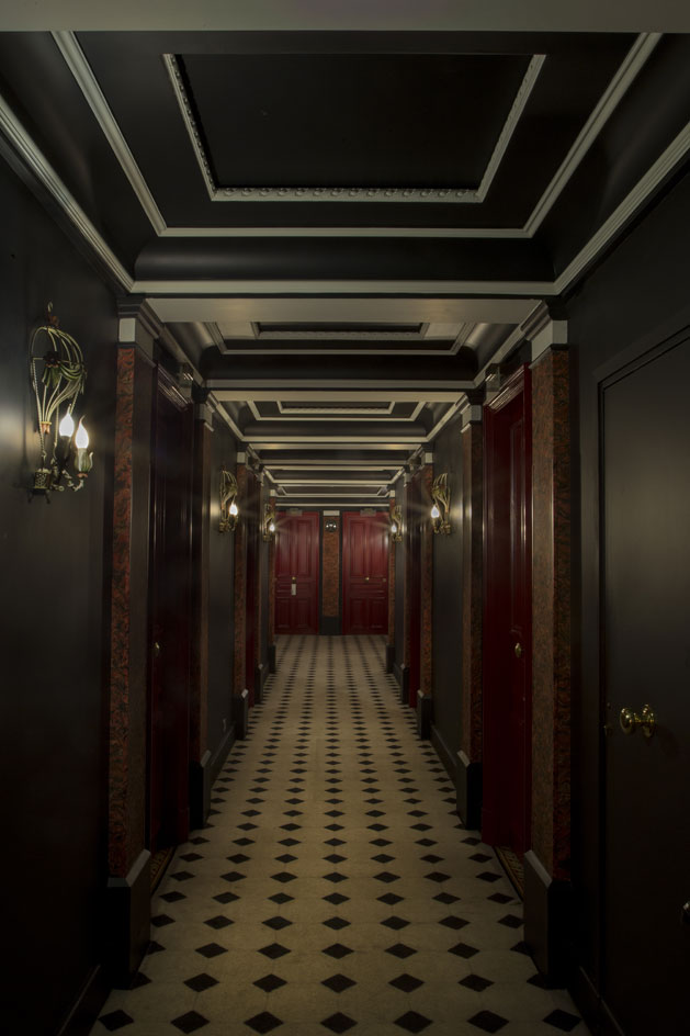 Sloan’s clever use of carpeting resembling herringbone parquet flooring or leopard skin, petite ballerina shoes on the front legs of a set of antique chairs and custom-made hot air balloon wallpaper for one of the hotel’s main staircases are just some of the details that make the space extraordinary according to Cohrssen.