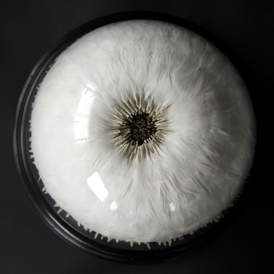 As a result of this finessing, and because each creation is unique, the artist is ultimately moving through her own evolutionary process. Pelt, a different wall-mounted grouping consisting of kid leather punctured with crow quills, yielded an interactive piece whereby viewers can place their hand under the base through a hole in the pedestal. ‘Have a fondle!’ she quips.