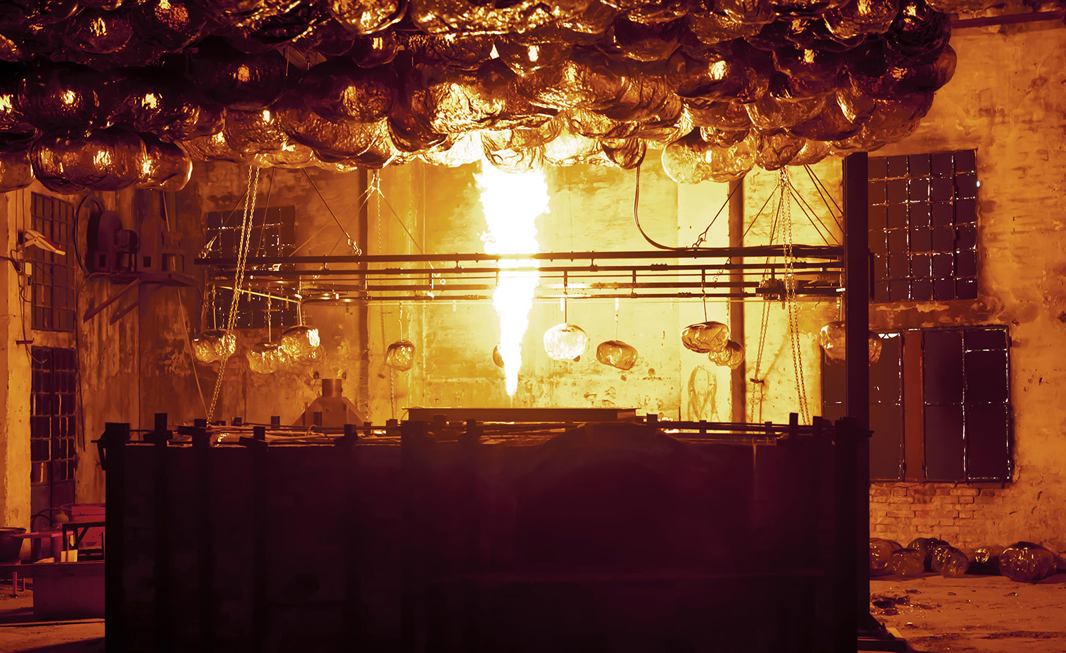 Fog fills the main installation space, while the ceiling is lined with 1,000 grey-hued glass chandeliers made from hourglass sand. They glow and dim with a brooding soundtrack that calls to mind a suspense scene in a science-fiction film. One area of the factory is sectioned off, with glassblowers creating the ceiling pieces using a century-old kiln. Once they’re made, they hang them on a conveyor belt and every so often, one piece is let go and crashes to the ground. The glass is then swept up and recycled to make new pieces.
