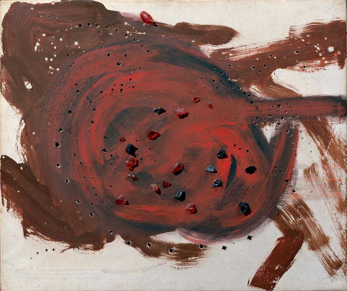 His wounded canvases reflect Milan’s ruined treasures, desecrated during the Second World War. These wounds give the work an ominous, threatening aura. Pictured: Concetto spaziale, L'Inferno, 1956.